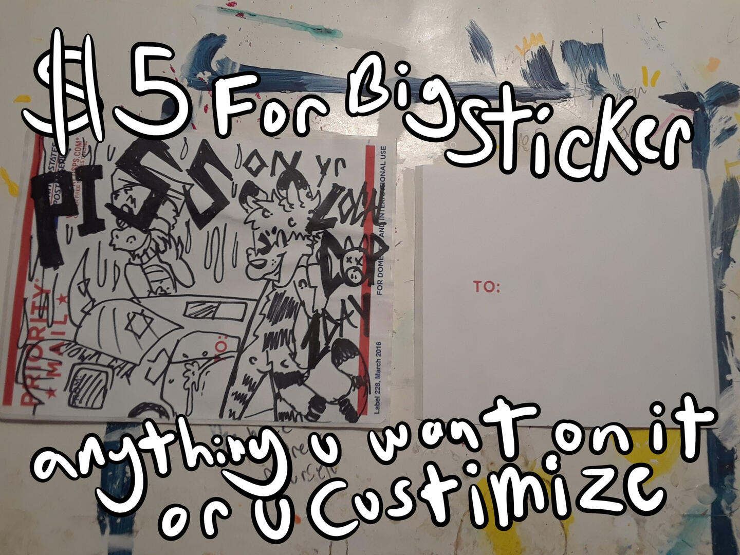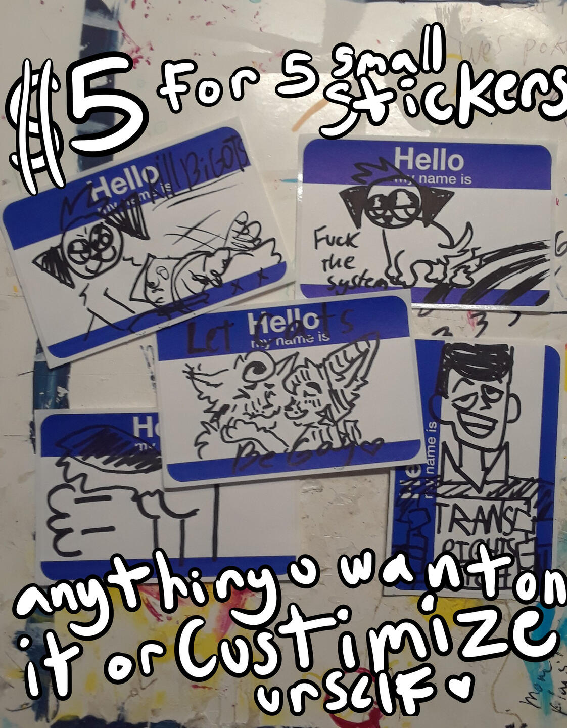 *Examples: (pack of 5 consisting of ur Oc's, funny memes sent by u, mlp/fnaf/fnf stickers, good vibe stickers, "TRANS RIGHTS ARE HUMAN RIGHTS" "FUCK 12" "LOVE UR FRIENDS" "FAGS DESERVE RIGHTS") *